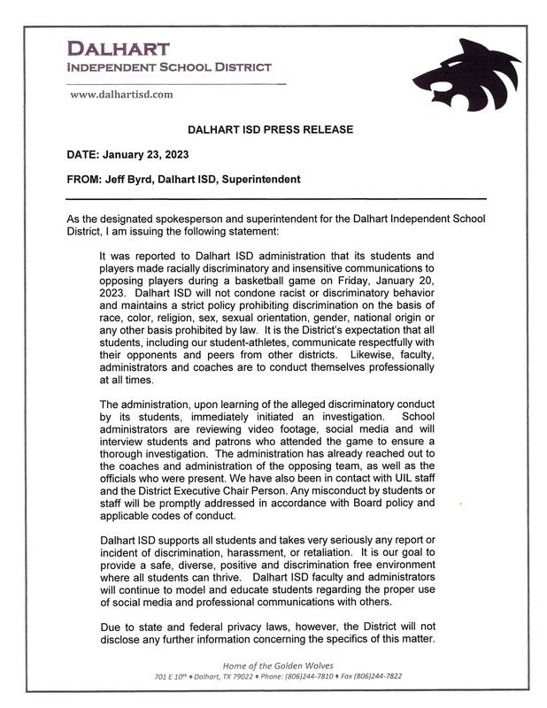 Dalhart ISD Press Release January 23, 2023