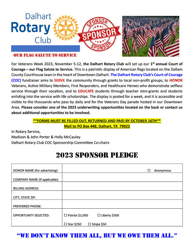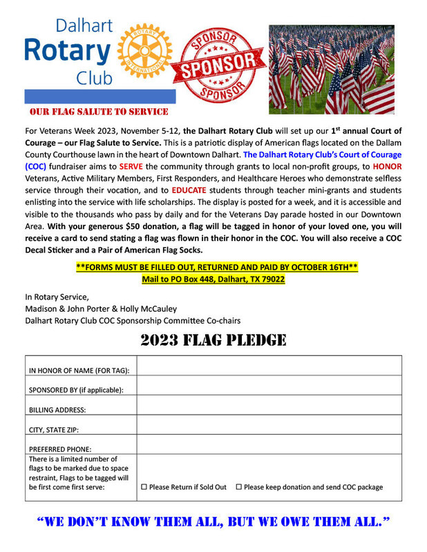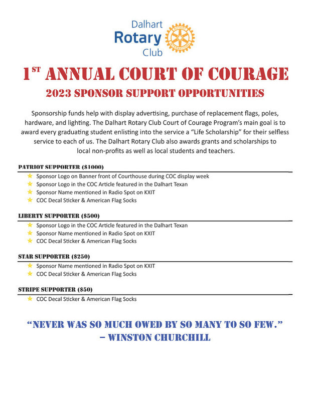 Please support this Dalhart Rotary Club fundraiser. The majority of the proceeds from the fundraiser will be used to provide scholarships for our DHS Graduates that will serve in the armed forces.