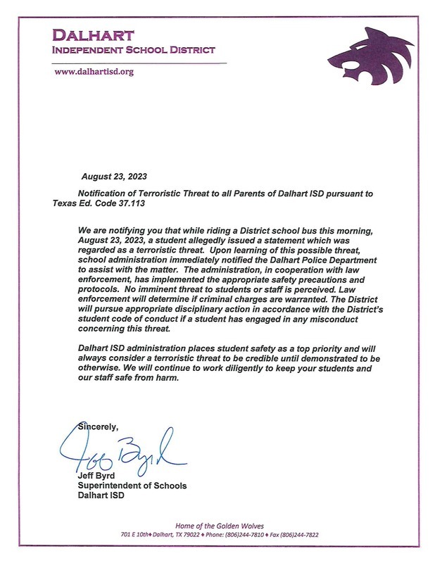 Notification of Terroristic Threat